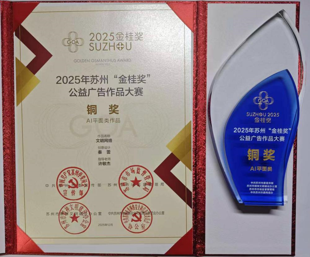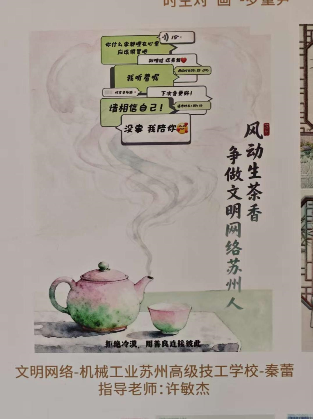 正是在师生的共同努力下,秦蕾同学完成了AI平面类作品——《风动生茶香,争做文明网络苏州人》。该作品以“网络文明”为核心主题,通过富有层次的视觉叙事,生动传递出网络交流中倾听、陪伴与善意的重要性,倡导构建和谐健康的网络环境。作品巧妙地将当代苏州人的网络文明愿景转化为具象画面,让抽象倡议变得可感可知,通过艺术语言传递了社会正能量,弘扬了社会主义核心价值观。最终,凭借出色的创意与设计表现,该作品从众多参赛作品中脱颖而出,成功斩获AI平面类作品铜奖。