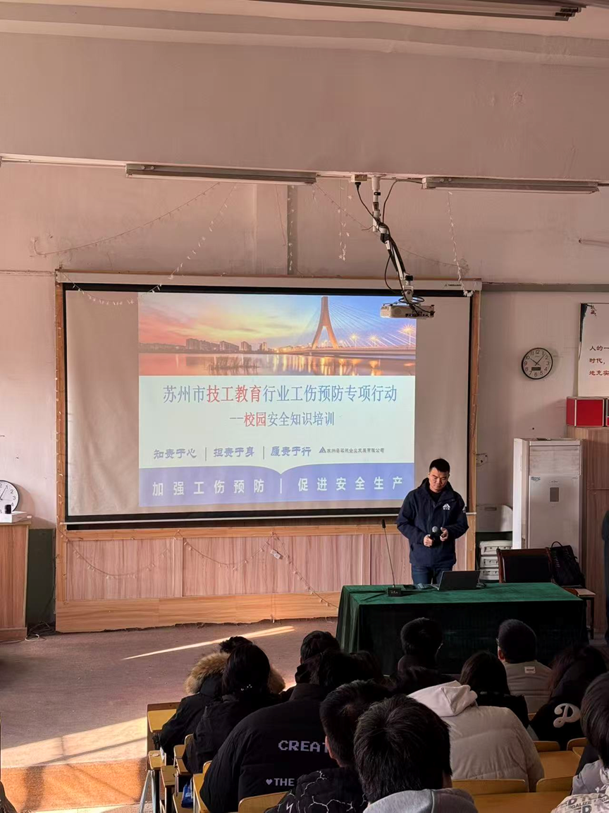 2026年1月9日上午,由苏州市人力资源和社会保障局组织的技工教育行业工伤预防专项行动--校园安全知识培训在我校顺利开展。培训共有20名教职工和80名学生参与。