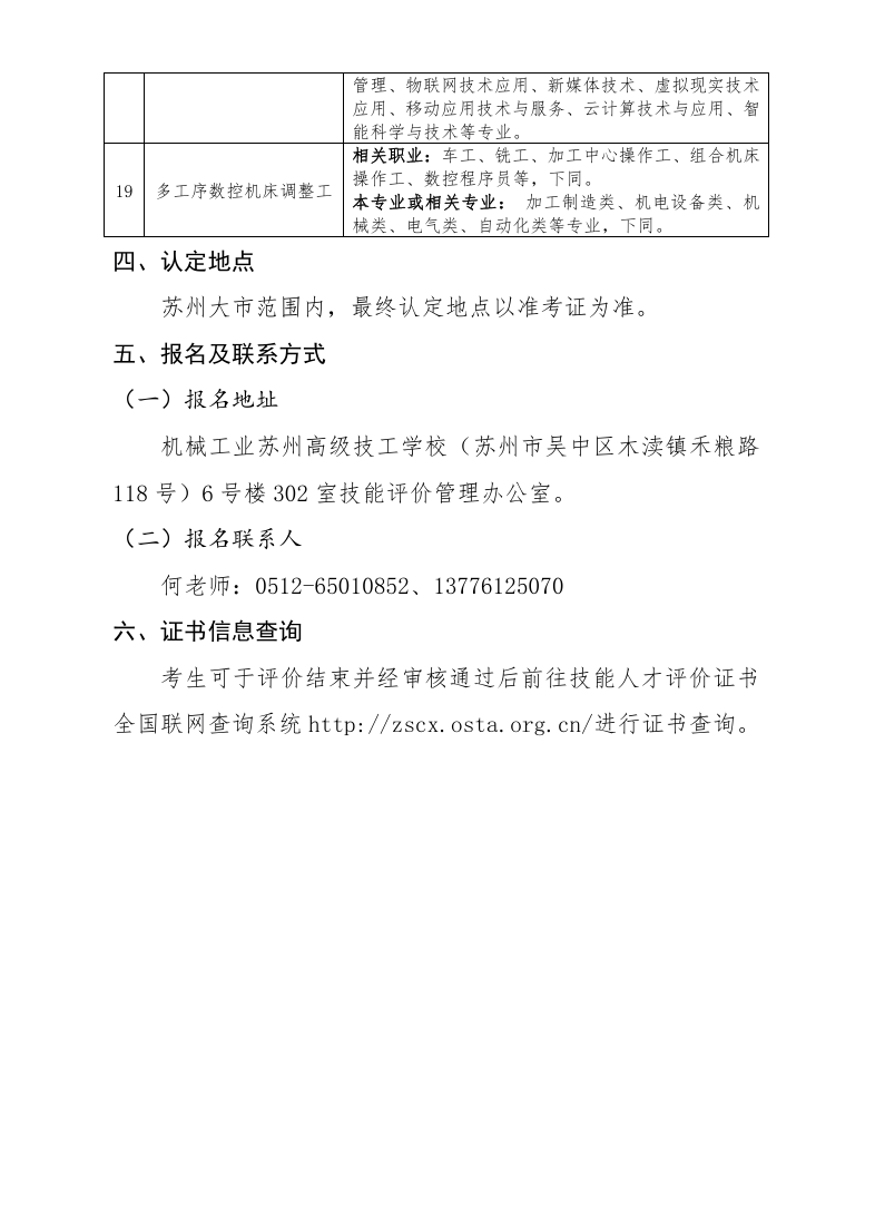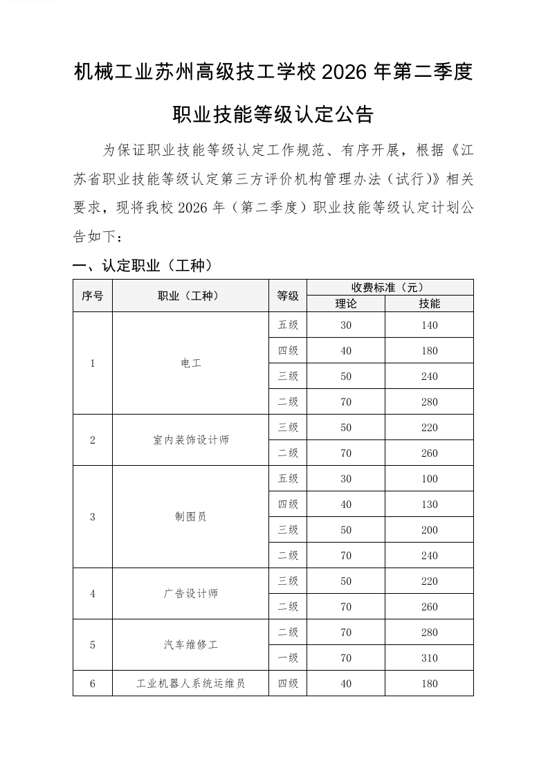 机械工业苏州高级技工学校 2026年第二季度 职业技能等级认定公告