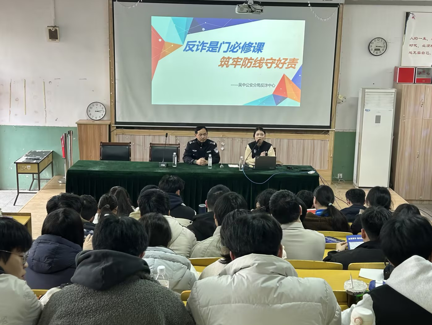 为提高学生反诈防骗意识,守护学生的人身财产安全,3月23日,学校特邀法治副校长府锦华警官到校,开展“青春无诈,守护同行”主题反诈宣传讲座,全体学生、班主任参加。